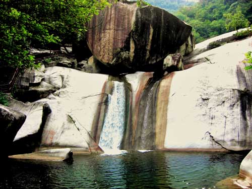 伏牛山世界地质公园地貌景观表现出与造山运动的亲缘关系,尤其是以主造山期花岗岩“锯齿岭”地貌、伸展拉张期花岗岩“岩盘山”地貌、板块机制下俯冲型花岗岩的“五行山”景观和碰撞性花岗岩的“卸荷裂解”景观、壳幔混合型花岗岩的“石柱峰丛”景观等,体现了造山带花岗岩地貌类型的多样性。以碳酸盐构造岩片和断裂带糜棱岩化大理岩为造景母体的构造岩溶“塑性流变”景观,体现了造山带的岩溶地貌和异质生特征。水文景观表现为先成河与后置河交织、河源湖与准平原伴生、瀑布群组叠挂、跌水与瓯穴毗邻,展示了新构造运动节律和河流地貌作用的继承性特征。