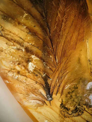琥珀被称作时空胶囊的名头真不是白叫的,甚至有的时候可以保存色素,这就为古生物复原图画师提供了最直接的证据。笔者并不是什么专家,只是爱好者一名,没法通过科学的角度来介绍这根羽毛,只能转述专家所言:此根龙羽具有非常纤细的羽轴,互生的羽枝,以及发达的羽小枝,所有这些特点其实不太适合飞翔,可能只是起到保暖和装饰的作用。