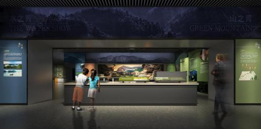 自然资源展厅:整体二层自然资源展厅以展示“重庆特色自然资源”为主体内容导向,来向观者只管展示,内容体系划分为第一部分:自然资源展区主要展示重庆自然资源的分布概况山林湖草,矿产资源,等,通过场景带动趣味知识点直观的展示重庆自然资源概述,第二部分则是展示:人与自然,内容侧重点子啊与,在我们拥有这些资源的基础上我们人类如何利用和保护自然资源,和谐共生的理念,整体展厅在大的色彩语言上以绿色作为主线贯穿始终,根据内容的演变在同系明度进行过度,例如水资源展示区域的局部蓝色,田地资源展区的橘色,直观概念表达的基础上又在同一个感知维度内,我们利用整体颜色饱和度的降低来增强空间视觉的高级感以及舒适感避免过度鲜艳的颜色会对观者的观展体验产生视觉疲劳。