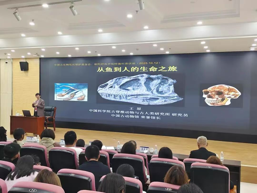 会议期间,基金会专家委员会副主任、中科院古脊椎动物与古人类研究所王原研究员,基金会专家委员会委员、北京大学地球与空间科学学院江大勇教授走进朝阳师范学院,为在校师生送去科普讲座。